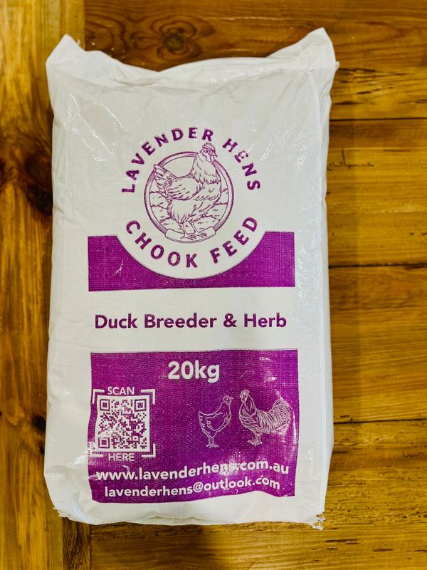Lavender Hens Duck Breeder & Herb Mix is a complete daily feed for breeding ducks, enriched with herbs known for natural worming and health benefits. It supports fertility, strong eggs, digestion, and immunity—promoting overall vitality and wellbeing in your flock. A wholesome blend for healthy, productive ducks —naturally